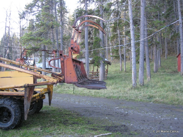 We walked down to investigate. Oh my. He was trying to do something with his septic tank in his yard with the Farmhand. (A Farmhand is kind of like an old tractor that has a lift on the front end & 'claws' for picking up bales, etc.) When he backed into his yard the 'claws' were lowered. When he was finished in the yard, he drove out, not realizing the 'claws' were up. He somehow managed to entangle the power lines, snap two wires, pull over a power pole, knock the line off the insulator on his house & in all of that, he didn't electrocute himself.